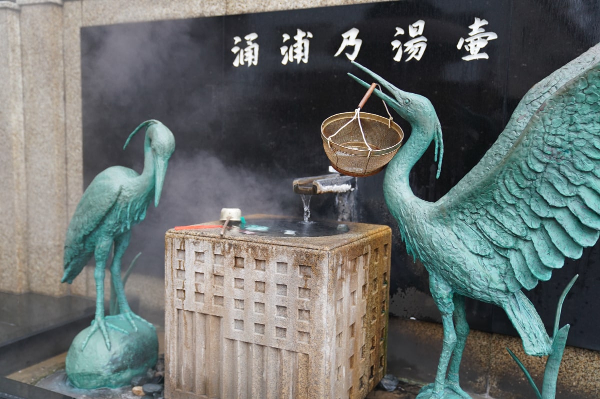 和倉温泉の開湯にまつわる白鷺(しらさぎ)伝説の「湯気立つ海で傷を癒す白鷺」のブロンズ像が置かれた「湯元の広場」は、自分で温泉卵が作れる場所です。