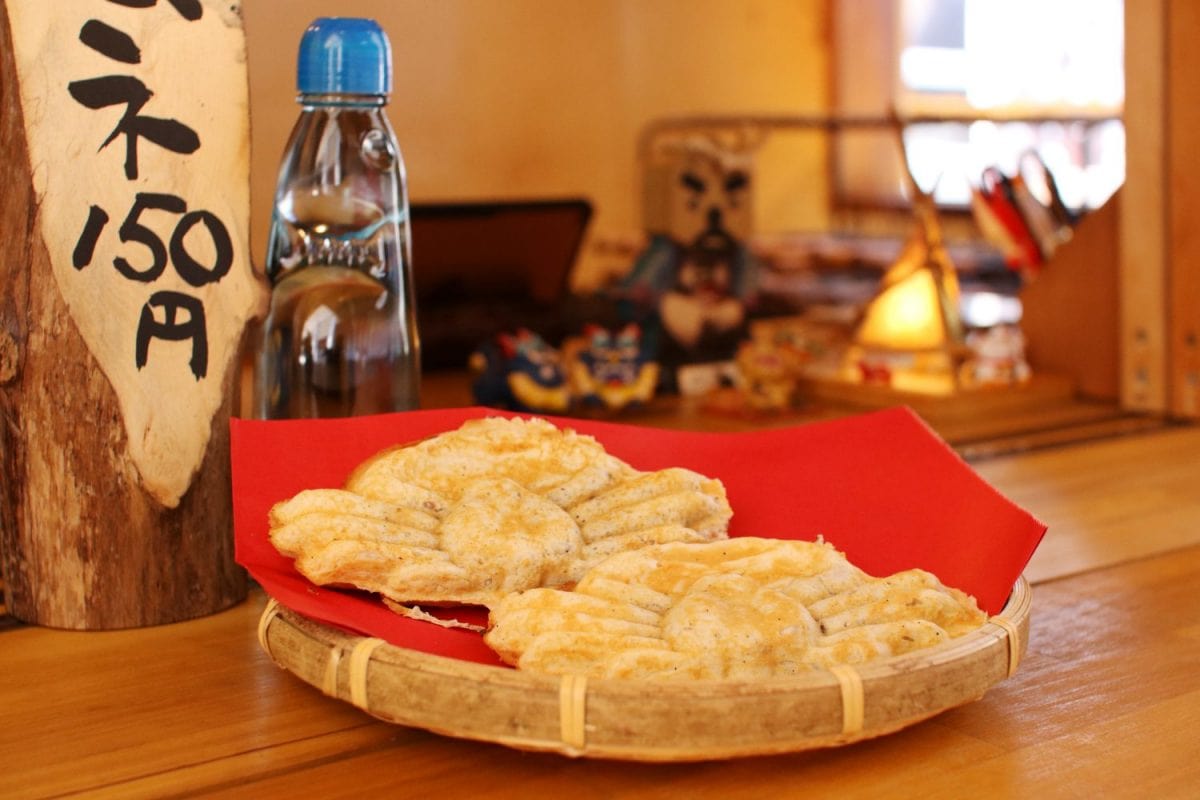 「海老のや」の商品の中で、ぜひ食べ歩きで味わいたいのが、揚げたてサクサクの「海老入り揚げたて餅」(85g袋、430円)。