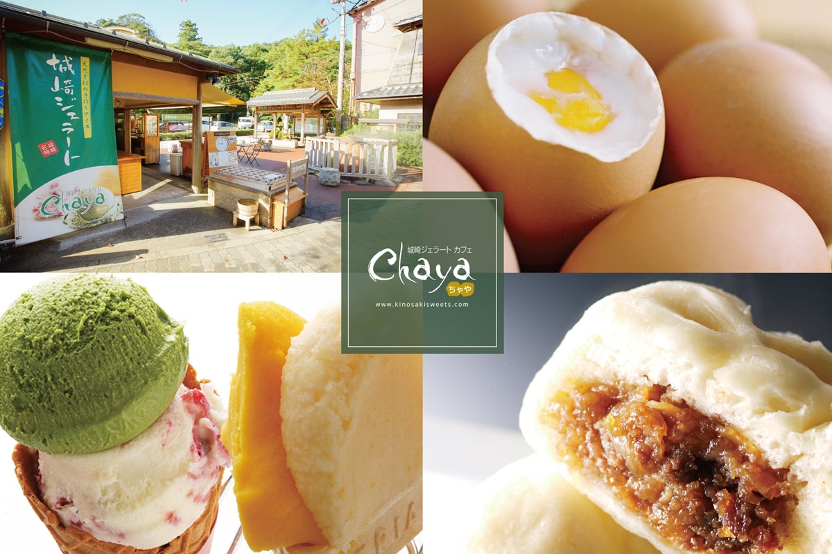 薬師公園ポケットパーク内にある「城崎ジェラートカフェchaya(ちゃや)」は、城崎温泉の源泉で自分で作る「ぷるぷる温泉たまご」(350円)や天然素材100%にこだわった「ジェラート」が人気の店。