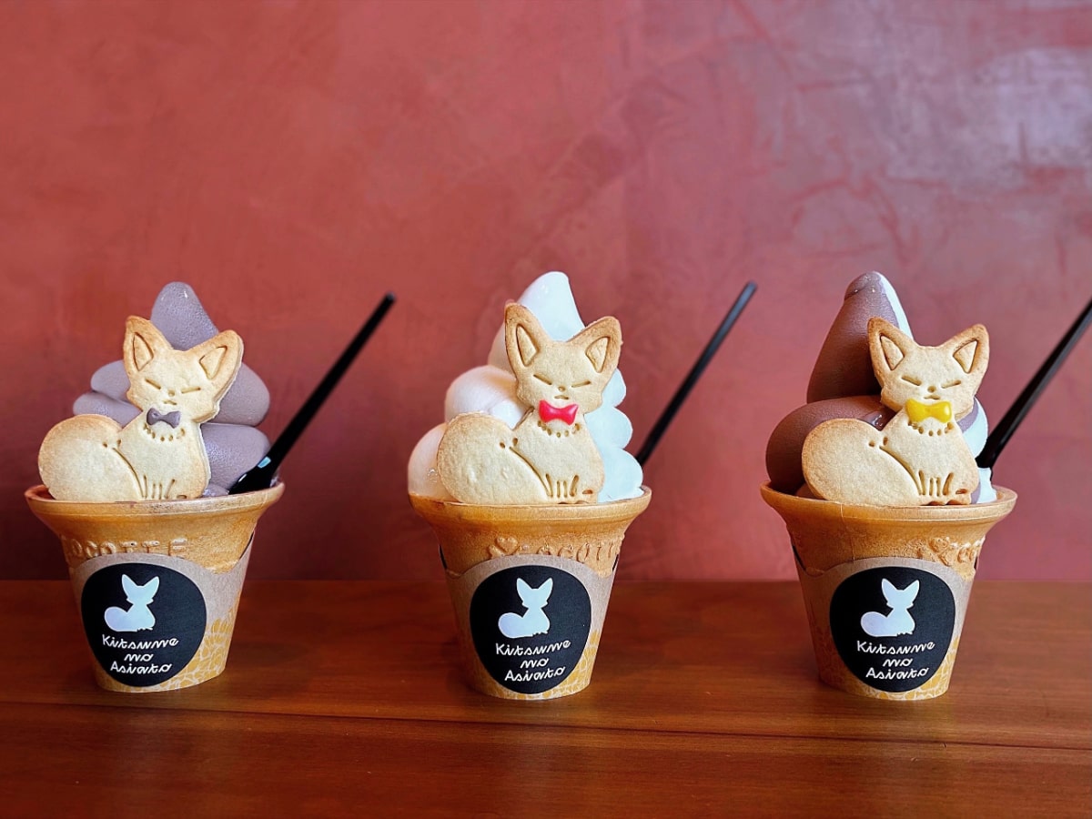 テラスの足湯で自然を感じながらくつろげるカフェ「狐の足あと」は、店名にも入った狐をモチーフにしたスイーツが人気。「こぎつねソフト」(500円)は、甘さ控えめのソフトクリームに湯田温泉の白い狐クッキーが乗った愛らしい人気のスイーツです。