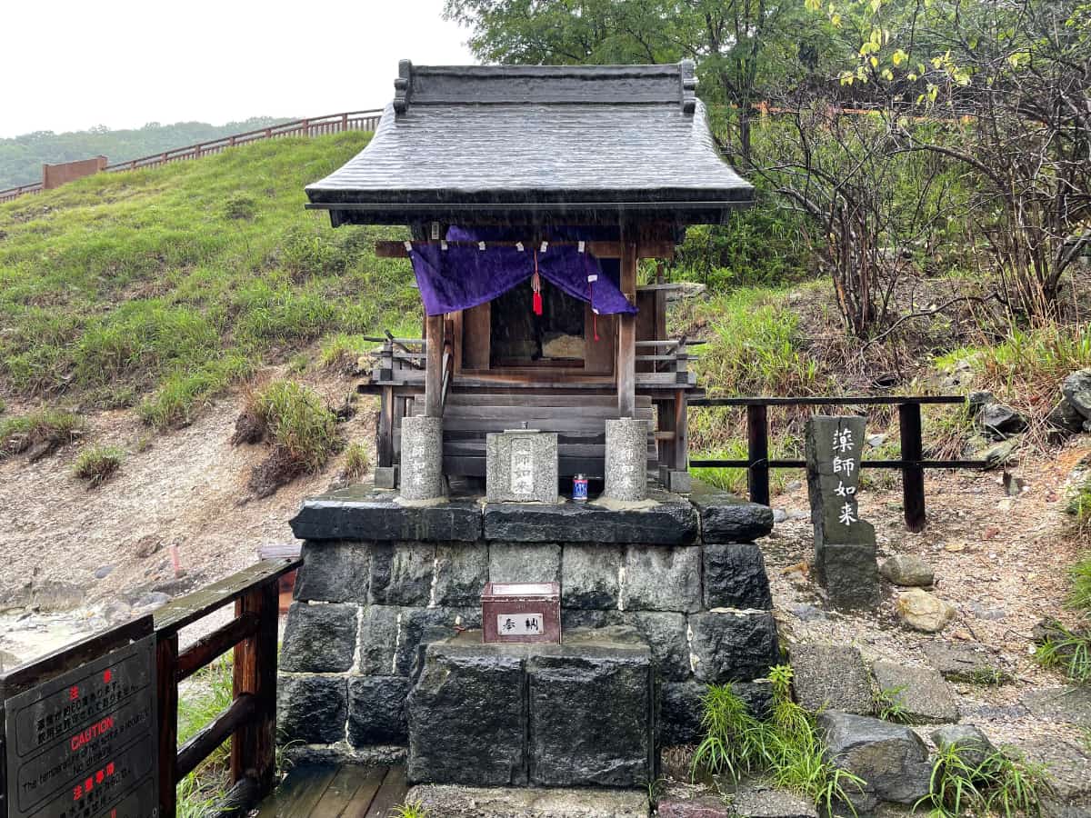 堂内には石碑が安置されていますが、これは、文久元年(1861年)に、硫黄を採掘していた南部(なんぶ)藩の家臣が、お堂の下で湧く温泉で眼を洗うと眼病が治ったため、そのお礼として寄進したものです。