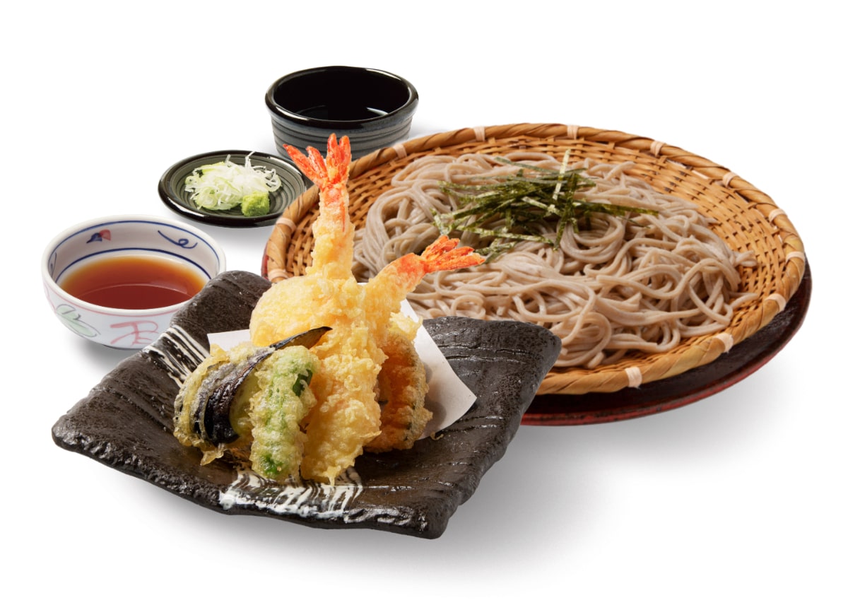 コシのある自家製蕎麦に大海老天ぷら2本付きの「大海老天ざる蕎麦」(1,280円)も幕張温泉の不動の人気メニューです。サクサクの衣に包まれた大海老のプリプリの身がたまりません。