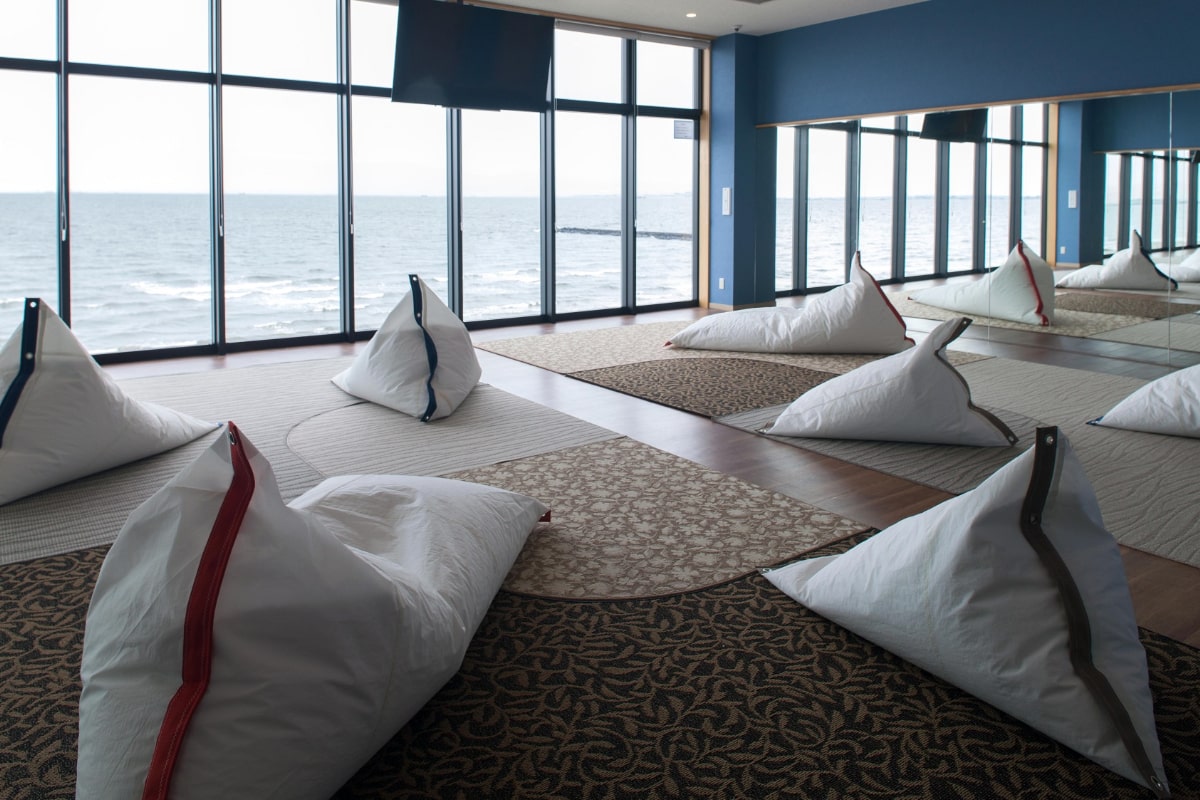 大きな窓一面に広がる海を眺めながらアクティビティが楽しめる「多目的ルーム」では、ストレッチ講習・ヨガ教室などスポーツリラクゼーションイベントなどが、定期的に開催されています。