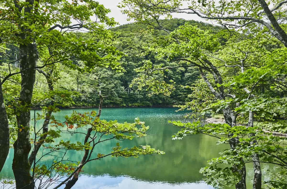 徒歩15分ほど遊歩道を歩くと、透き通ったエメラルドグリーンの「ドッコ沼」(周囲約350m、平均水深2m)が現れます。