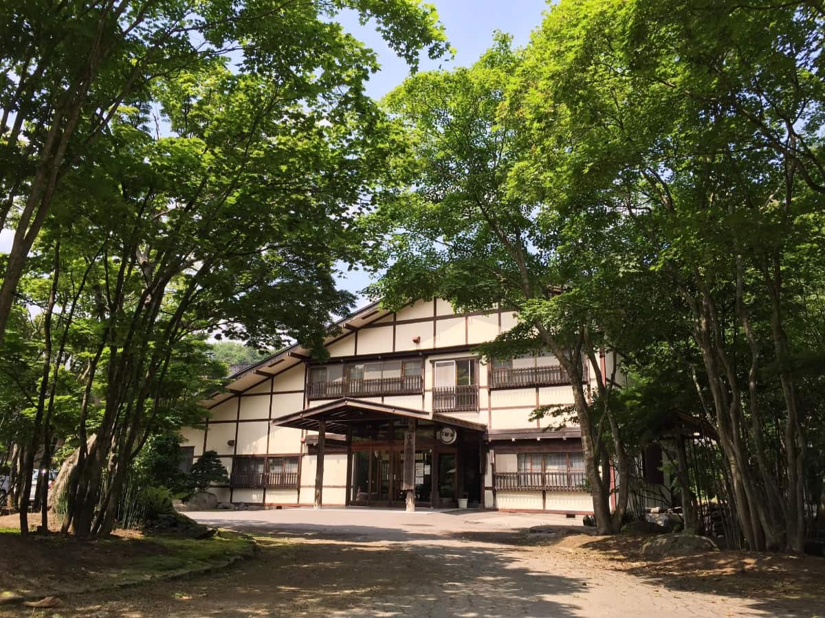 上の湯温泉は、海に囲まれた八雲町に流れる落部川(おとしべがわ)の上流の山あいに位置する温泉地です。川べりには野天風呂、周囲は手つかずの原生林に囲まれた大自然の中、広大な敷地をもつ温泉旅館銀婚湯があります。