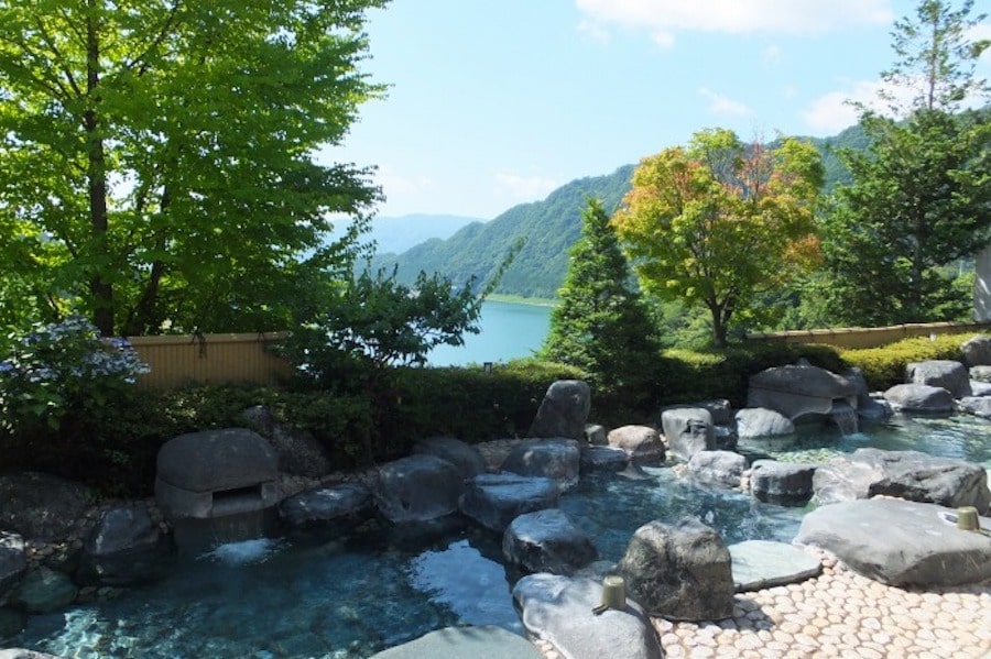 昼は山々に囲まれた赤谷湖、夜は満天の星が望める露天風呂「まんてん星の湯」
