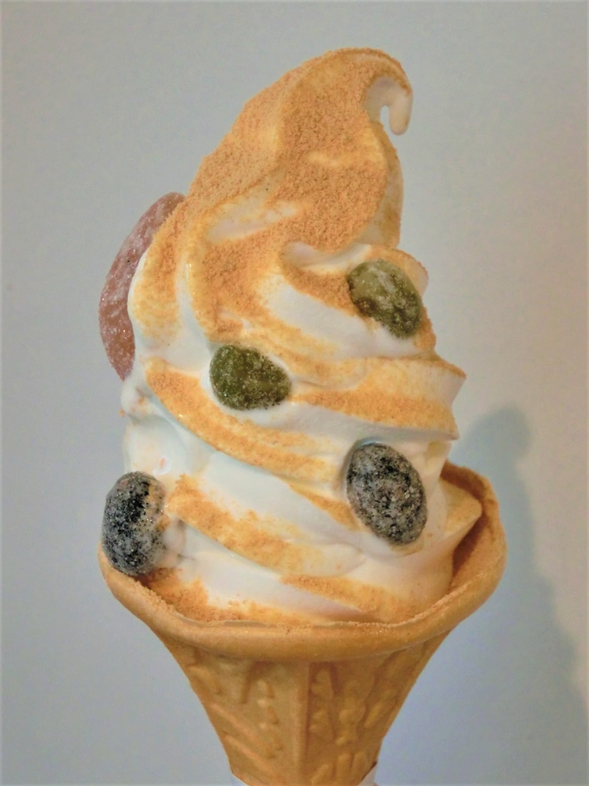 デザートのいち押しは「豆!豆!豆!ソフト」(430円)。ソフトクリームにきな粉と十勝の豆をトッピングした一品。3種類の食感が楽しめる甘納豆と、コーンの内側に隠れている小豆が濃厚なソフトクリームとよく合います。