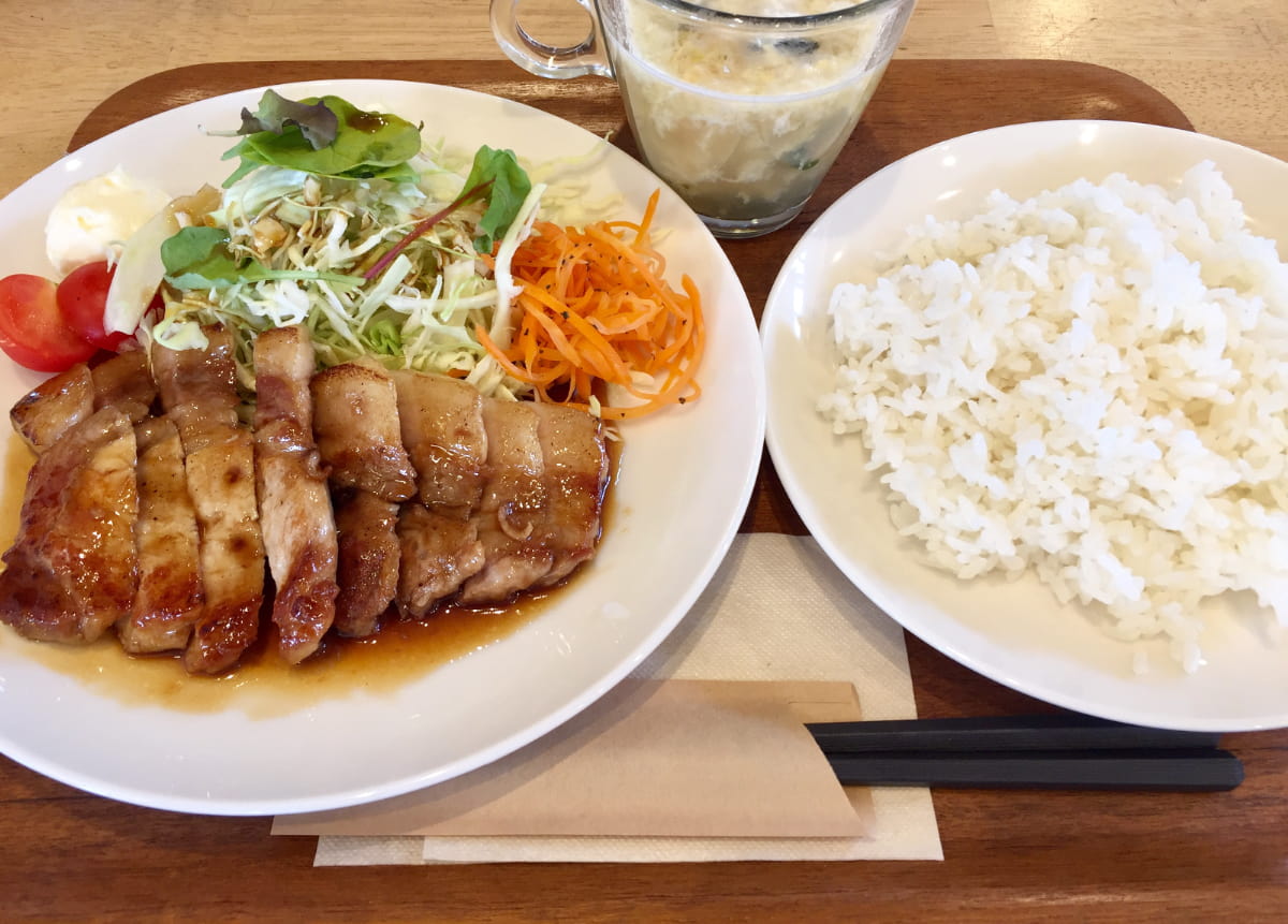 おすすめは1日10食限定の「森のカフェ ほっこりランチ」(1,100円)。ポークソテーは柔らかく、醤油ベースがご飯と好相性。地元野菜を種類豊富に使った付け合わせは彩り豊かです。
