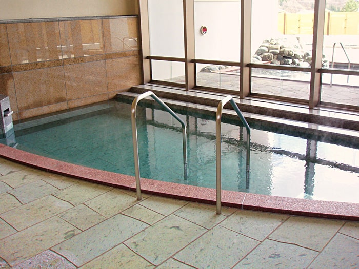 周囲の山々や塩田平(しおだだいら)のパノラマ広がる絶景の大浴場は、湯温は低めでさらっとした肌あたり。湯あがり処には数種類のお茶と水のサービスもあります。