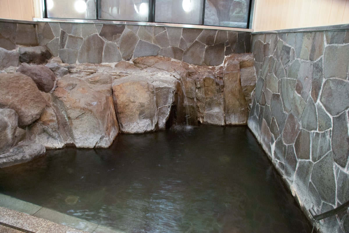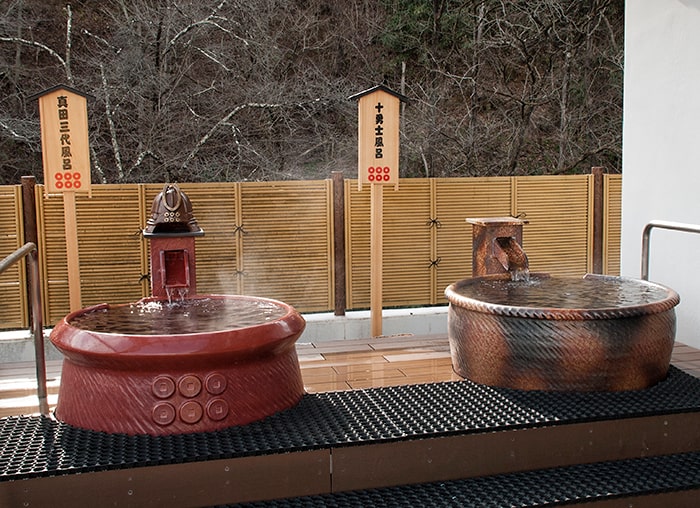陶器の壺湯もある露天風呂では、上田市街地を眺めながら入浴ができます。浴室出入り口には蛇口から源泉が出る飲泉所や掛け湯槽があり、別料金で岩盤浴も楽しむことも。