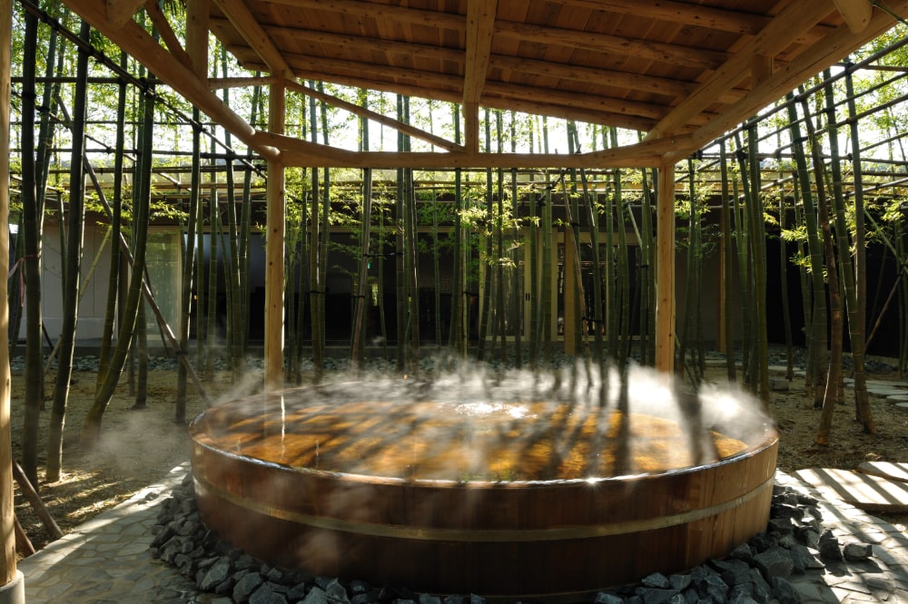 かすかに硫黄の香りが漂う源泉100%かけ流しの温泉は、ほどよいヌメリのある柔らかさが特徴。竹林を眺める露天風呂や広々とした内風呂で楽しめます。