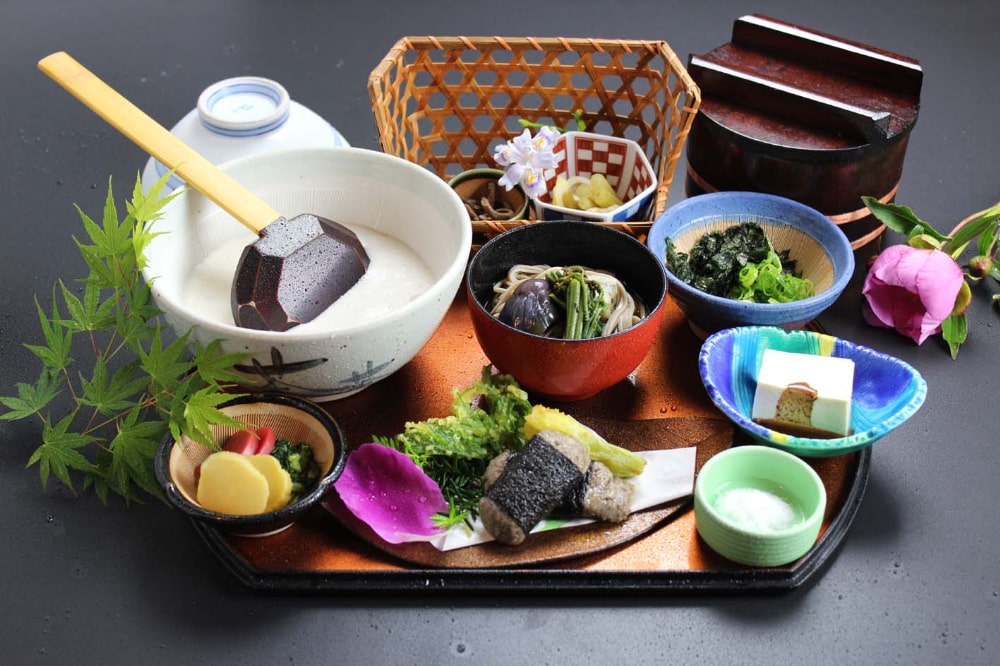 名物の「とろろ御膳」(雅、1,540円~)は、とろろ飯に、自然薯そばや自然薯豆腐などが付き、野趣に富んだ味が楽しめるセット。時期よっては鮎の塩焼きもあり評判です。
