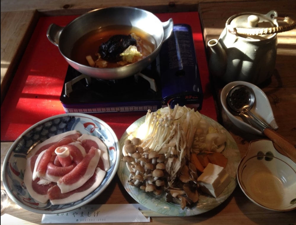 湯の山にある大人の隠れ家「囲炉裏(いろり) やましげ」では、囲炉裏のある個室で川のせせらぎに耳を傾けながら、心ゆくまで猪(いのしし)・鹿・鴨のジビエ料理を楽しむことができます。