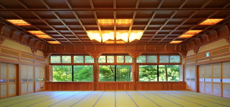 「山の神温泉 優香苑」は、宮大工により施された、美しい格子模様の格天井(ごうてんじょう)や巧みな細工が圧巻の宿。