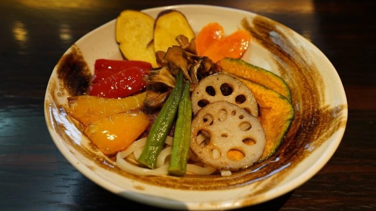 おすすめの「キーマカレーうどん・揚げ野菜トッピング」は、色とりどりの野菜が乗ったヘルシーなカレーうどんで、群馬の特産品でもある舞茸も入っています。