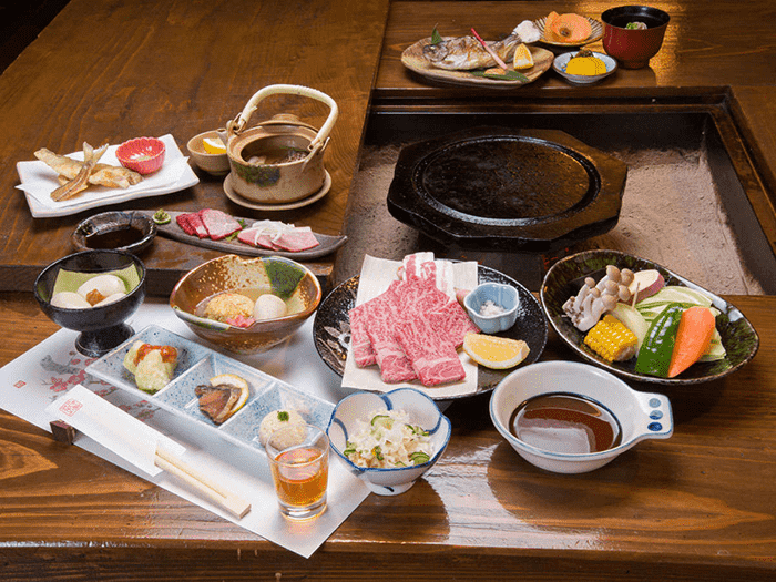 ご家族ご友人と囲炉裏を囲み、阿蘇山の溶岩を使ったプレートで、事前予約のお客様には特産のおおいた豊後牛を、また九重町の特産である九重夢ポークという無菌豚、飼料にハーブを使って育てたハーブ鶏などを召し上がっていただきます。