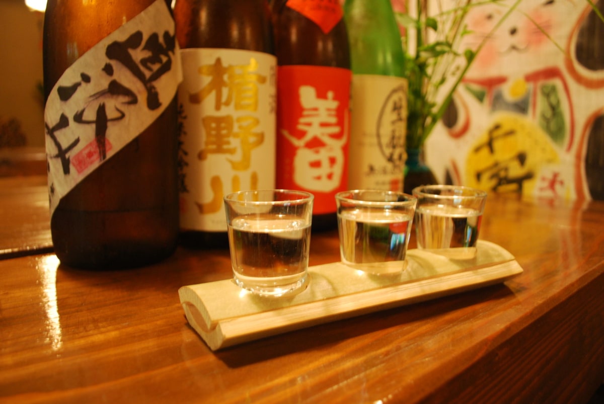 全国から取り揃えた日本酒は少しずつ比べて楽しめるように3種飲み比べセットなどとしてご提供しています。