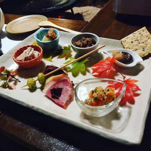 例えば、地元飯田高原の夏野菜のほか、秋田県名産のいぶりがっこにクリームチーズとナッツを和えたものや、福井県名産の鯖のへしこを切って炙ったものを前菜プレートとしてお出しすることもあります。