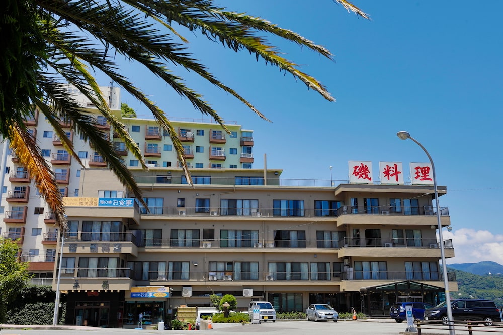 「ニューとみよし」は、南熱海にある長浜海水浴場まで徒歩6分と海岸まですぐの宿。熱海駅から電車で2駅の「伊豆多賀駅」が最寄りです。
