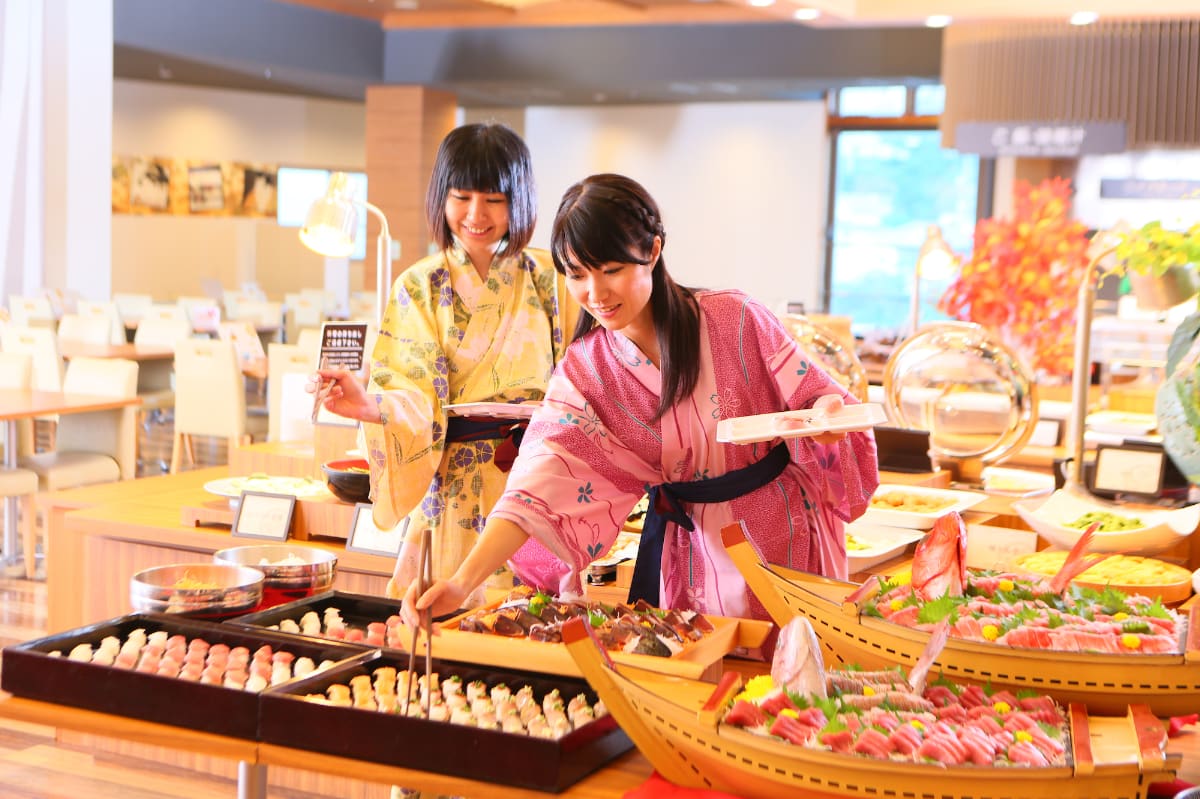 「大江戸温泉物語 熱海温泉 あたみ」のもう一つの目玉は、ディナーバイキング。温泉入浴とセットのプラン(4,308円)では、海鮮づくしの創作グルメバイキングなど、身体の内と外から熱海を満喫できます。