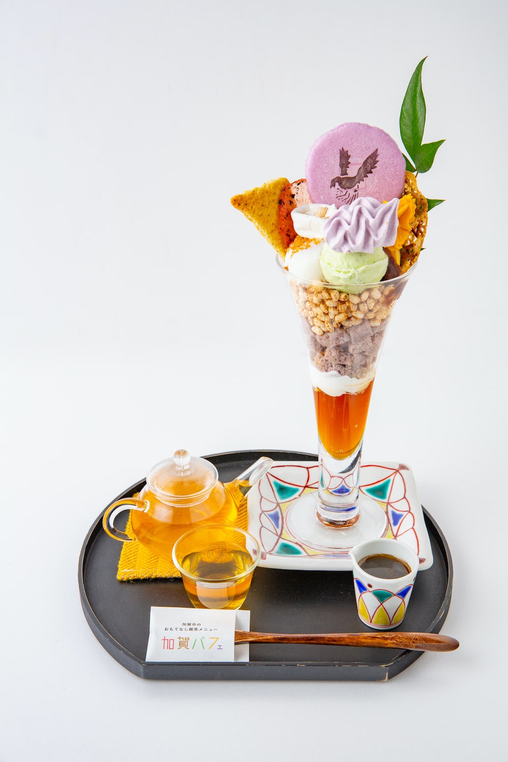見た目が鮮やかな「はづちを茶店」の加賀パフェは、加賀棒茶のゼリーにブロッコリーのアイス、ポン菓子に温泉卵など地元産の食材に、ブラックペッパーやはちみつが良いアクセントになっています。
