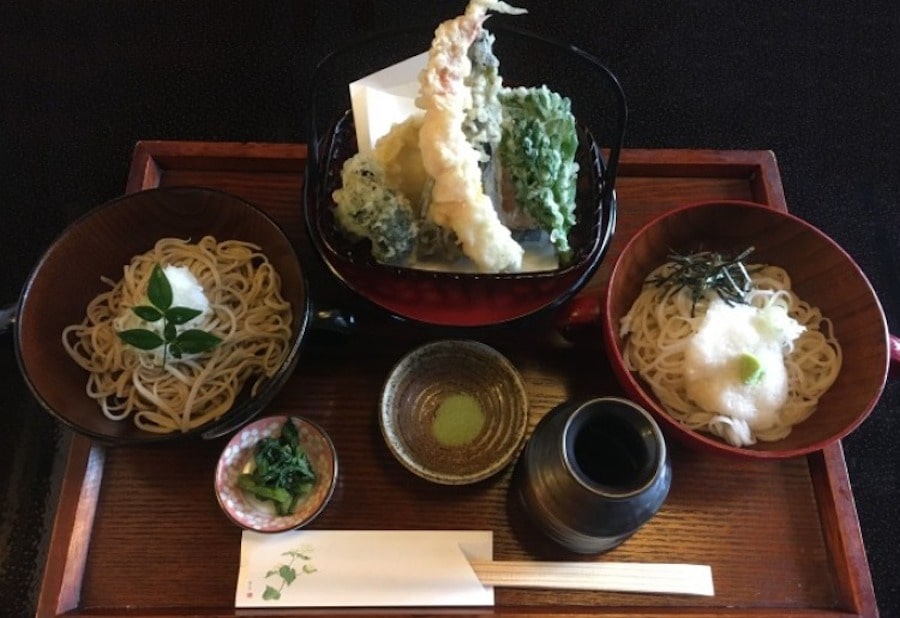 人気なのは「ふたみそば」(1,650円)。辛味おろし蕎麦、とろろ蕎麦の2種のそばにカリッとあがった天ぷらが楽しめます。