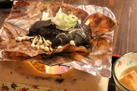 枯朴葉の上で焼かれた香ばしい味噌が、食欲をそそります。見た目もほっこりでき、焼きあがるまでも楽しめる一品です。