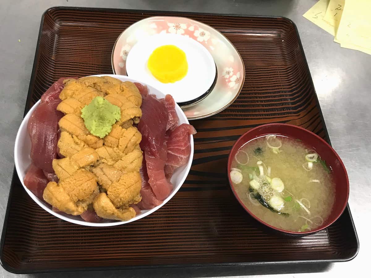 3月から9月頃に来店される方には、「うに、まぐろのダブル丼」(3,850円)をおすすめ。甘味のあるとろける舌触りの生ウニと、大間の本まぐろに大満足です。
