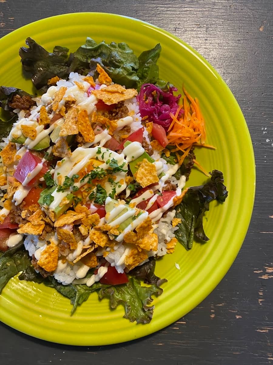 ランチでは、トマトベースのひき肉やキャベツ、チップス、温泉たまごなどが彩りよくご飯に盛り付けられた、優しい味の「タコライス」(900円)や「ドライカレー」(900円)が人気となっています。