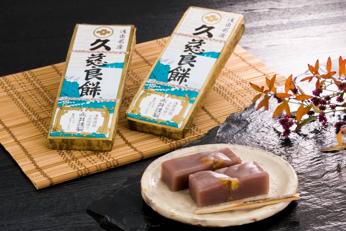 久慈良餅とは、米を製粉し、こし餡・砂糖などを混ぜて蒸し上げた薄い小豆色のういろうのような蒸し菓子で、中にくるみが入った浅虫の名物です。