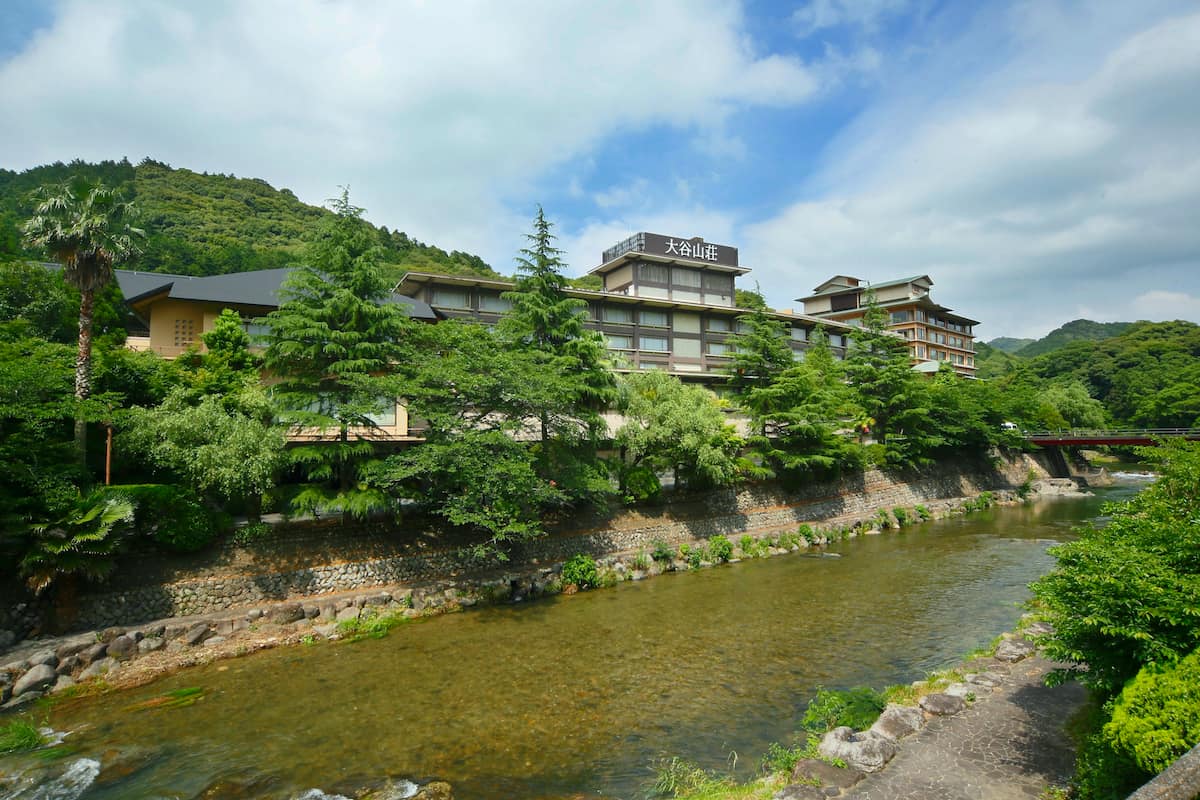 音信川(おとずれがわ)のほとりに佇む近代的な和風旅館「大谷山荘(おおたにさんそう)」では、音信川の渓流を臨みながら温泉を楽しめます。