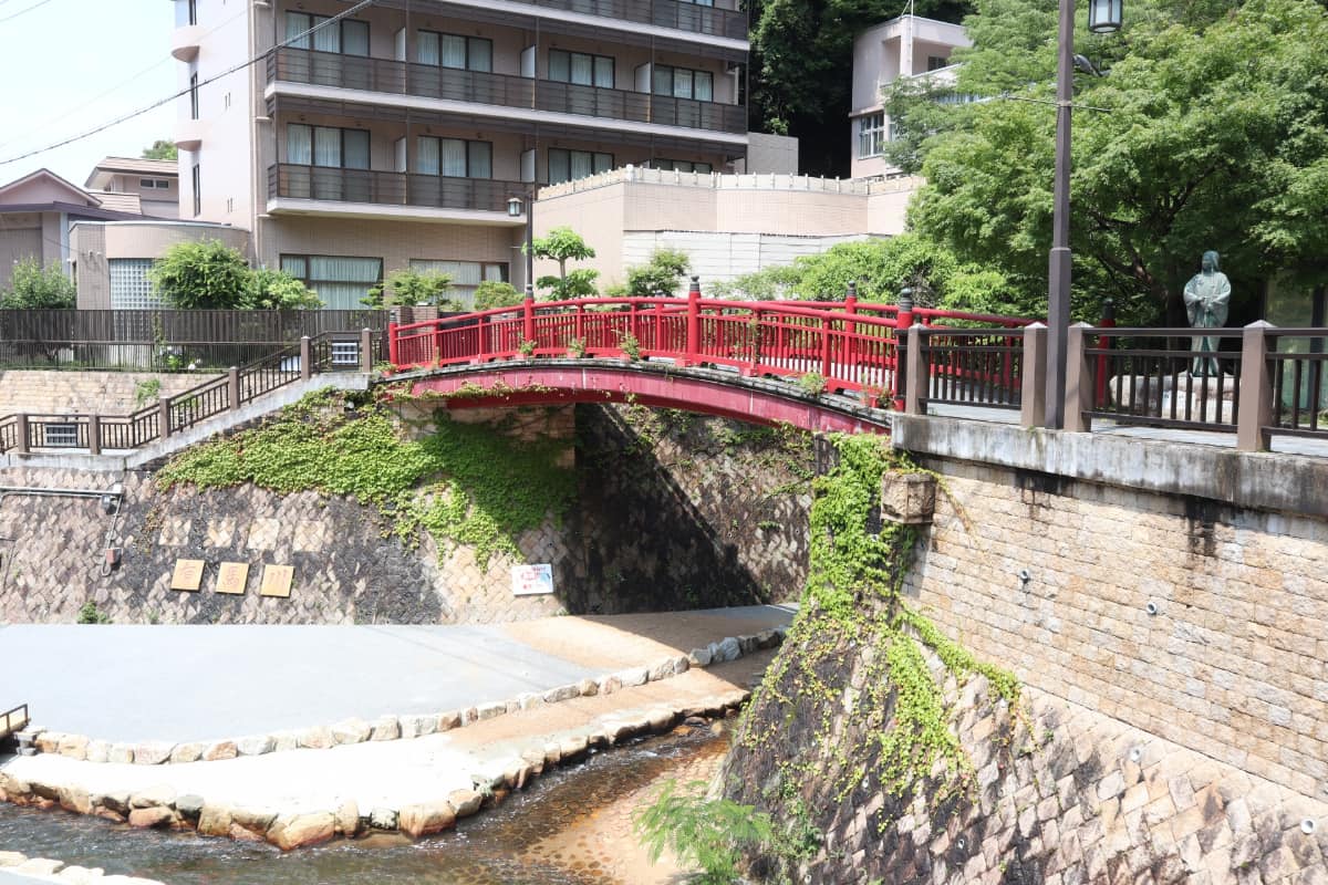 温泉街らしい土産屋などの風情を感じる街並みが広がる有馬温泉は、太閤秀吉が愛した温泉としても有名で、ひときわ目をひく赤い欄干の「ねね橋」に、温泉街入口には夜のライトアップが幻想的な「太閤橋」と、色々な秀吉公ゆかりのスポットがめぐれます。