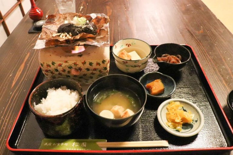 下呂駅から、温泉街に向かう道の途中にある「民宿・割烹 松園(みんしゅく・かっぽう しょうえん)」では、岐阜の郷土料理を定食で楽しめます。下呂温泉に到着してすぐに訪れることのできるスポットです。