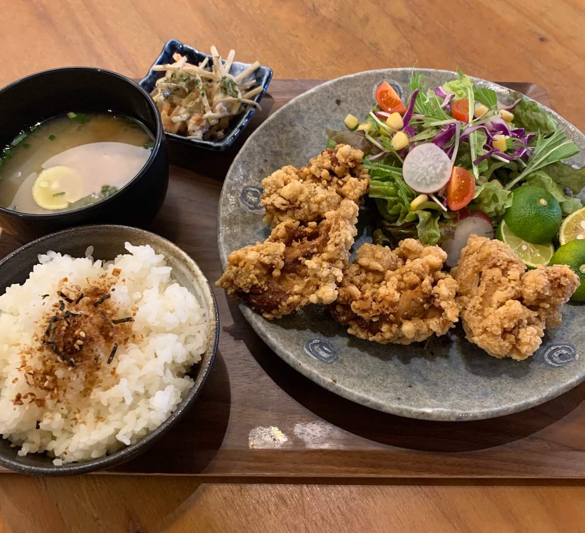お昼のおすすめは、5種類のソースからお好みを選べる「からあげ定食」(880円)。サクサクでジューシーな旨味が後を引き、ボリュームも満点です。