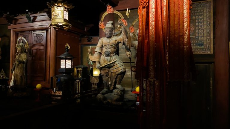 温泉寺のご本尊、33年ごとに御開帳される秘仏の「十一面観音立像(じゅういちめんかんのんりゅうぞう)」は、2mを超える大きな桧の一木彫り。この観音さまは、奈良時代の仏師(ぶっし)、稽文(けいもん)の手によって彫刻されました。大和の国の長谷寺の観音さまと同じ霊木よりもう一体の観音さまを掘り出そうとした稽文ですが、志半ばにして病に倒れ、未完成のままその観音さまは長楽寺(ちょうらくじ)というお寺にお祀りされることになります。