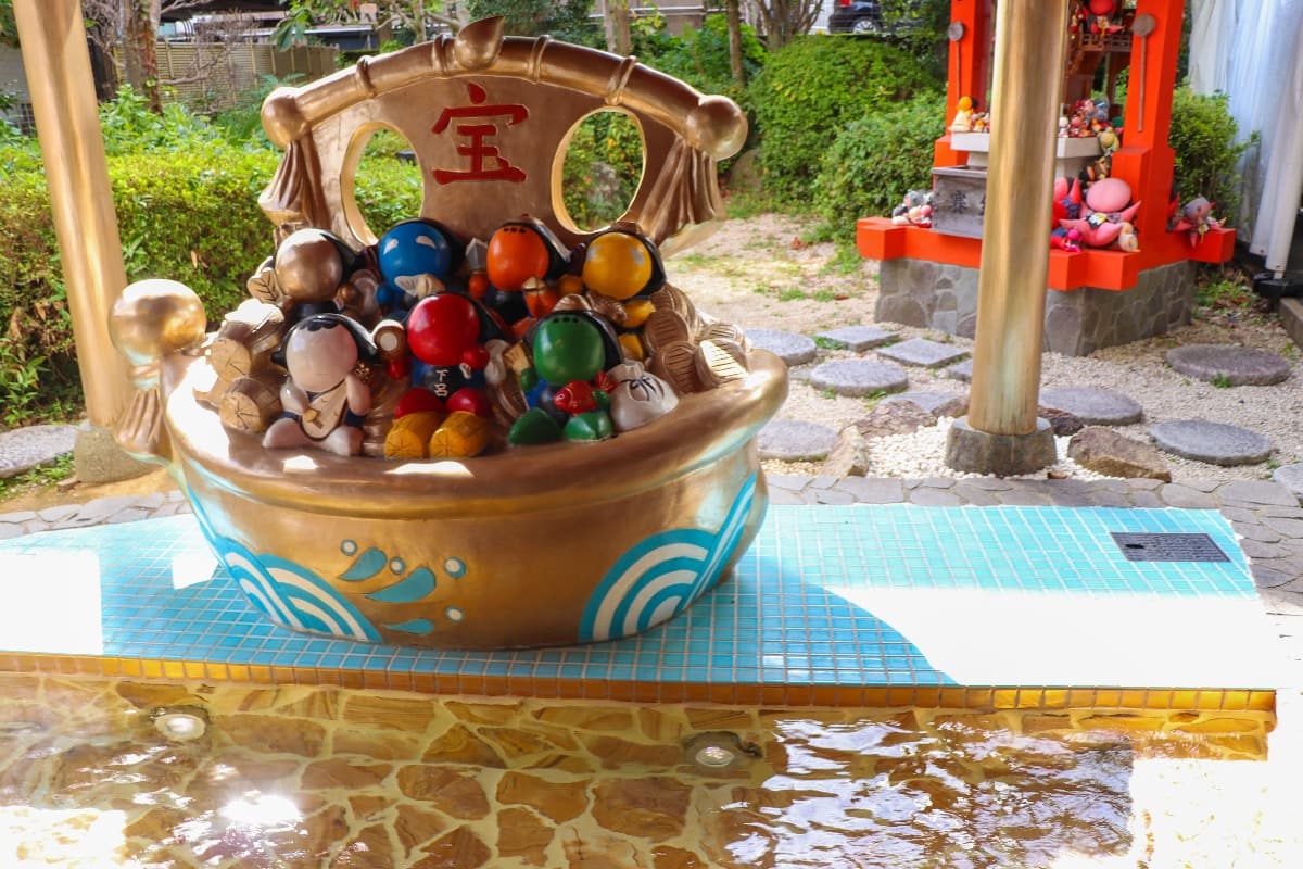 入口付近には足湯もあり、黄金の宝船にのったさるぼぼ七福神を眺めながらほっこり温まることもできます。