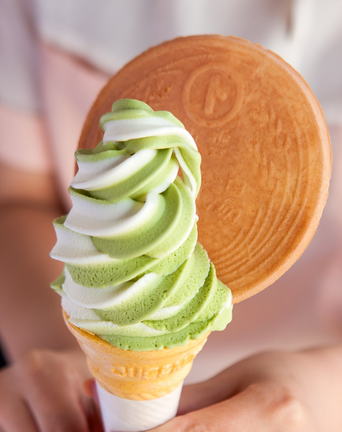 店頭では手焼きする様子が見られ、焼きたてを食べ歩きできます(1枚80円)。湯せんぺいをさしたソフトクリーム(380円)も人気商品です。