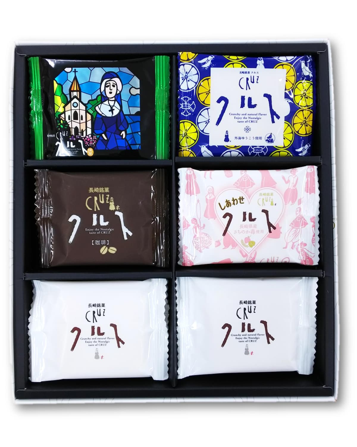 雲仙温泉で購入できる人気商品は「長崎銘菓クルス5種詰合せ」(18枚入で1,296円)。ホワイトチョコや珈琲、苺など1箱で5種類の味が楽しめます。