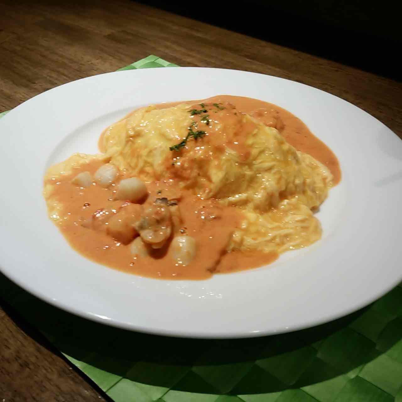 とろとろの玉子とエビやアサリ、貝柱など旨味がぎゅっと凝縮されたクリームソースが口の中でまろやかで優しいハーモニーを奏でます。