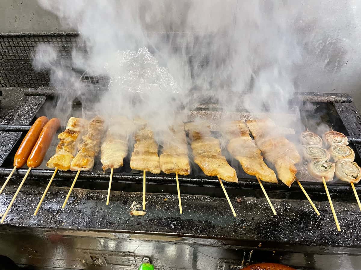 夜は、「串焼き」(90円〜)や「えのきホイル焼き」(350円)など、お酒が進むメニューが並びます。