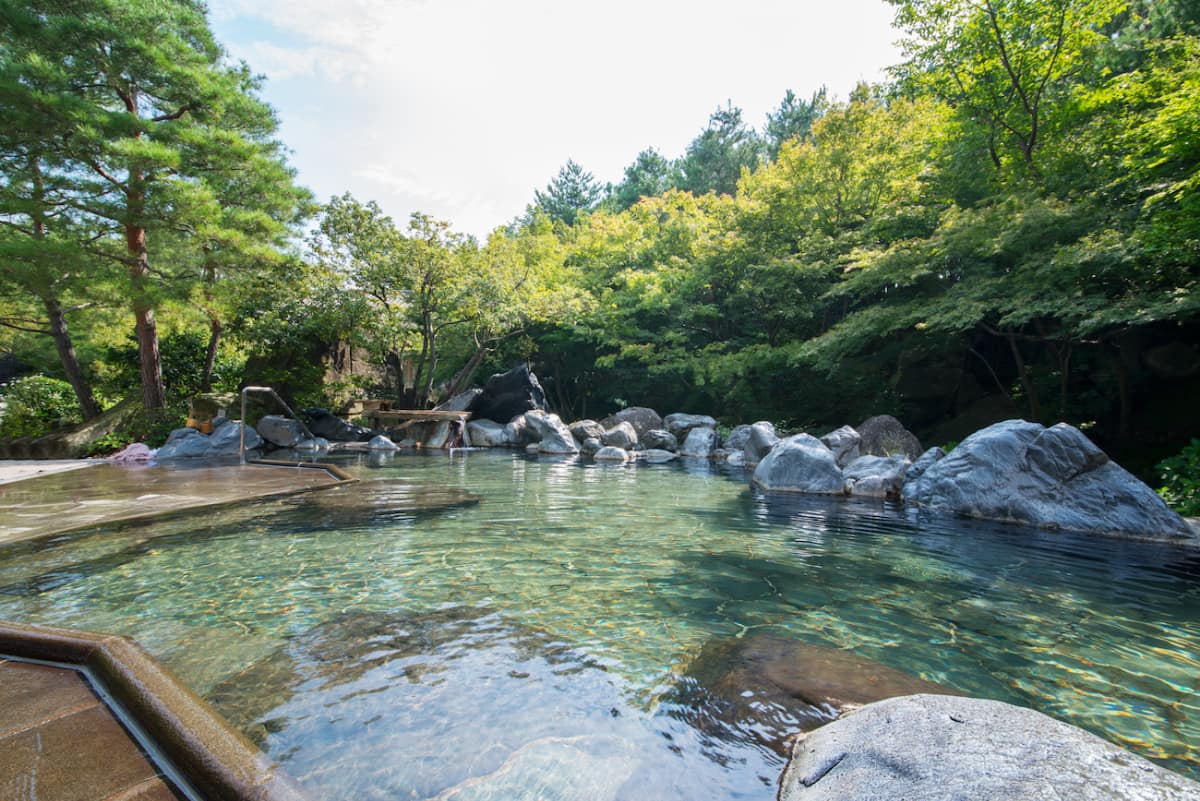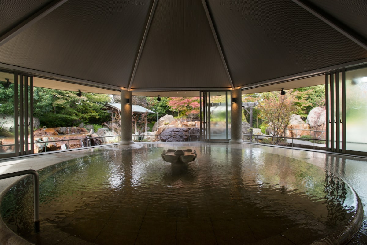 施設内には、奥入瀬(おいらせ)渓流や、黒部(くろべ)峡谷をイメージした温泉など、男女合わせて17種類の露天風呂や内湯があり、神経痛やうちみ、美肌に良いとされるアルカリ性単純温泉(緩和性低張高温泉)を堪能できます。