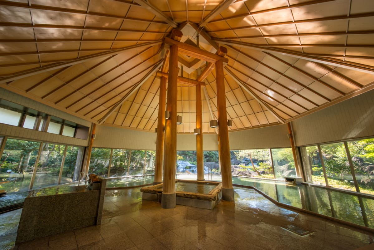 四角・五角・六角柱状の銘石「六方石(ろっぽうせき)」でしつらえた露天風呂や、サウナやミストサウナもある広々と明るい大浴場で、関節リウマチ、神経痛、疲労回復、冷え性などに効能のある、ナトリウム-塩化物温泉にゆっくりと浸かれます。