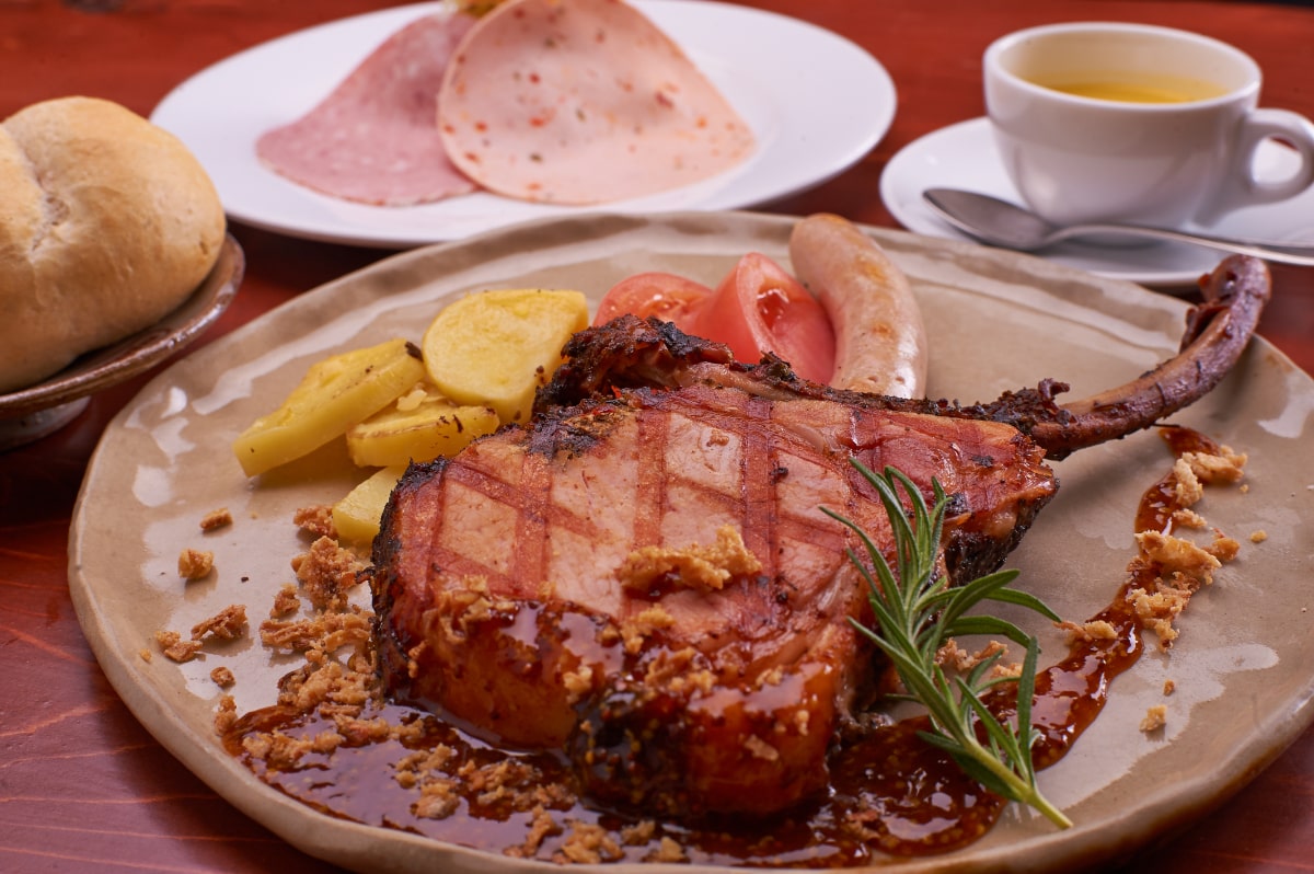 中でもおすすめは「リブボーンステーキポークセット」(前菜・スープ・パン付きで2,230円)で、表面は香ばしく、噛むとジューシーな脂が口に広がり至福の時が過ごせます。