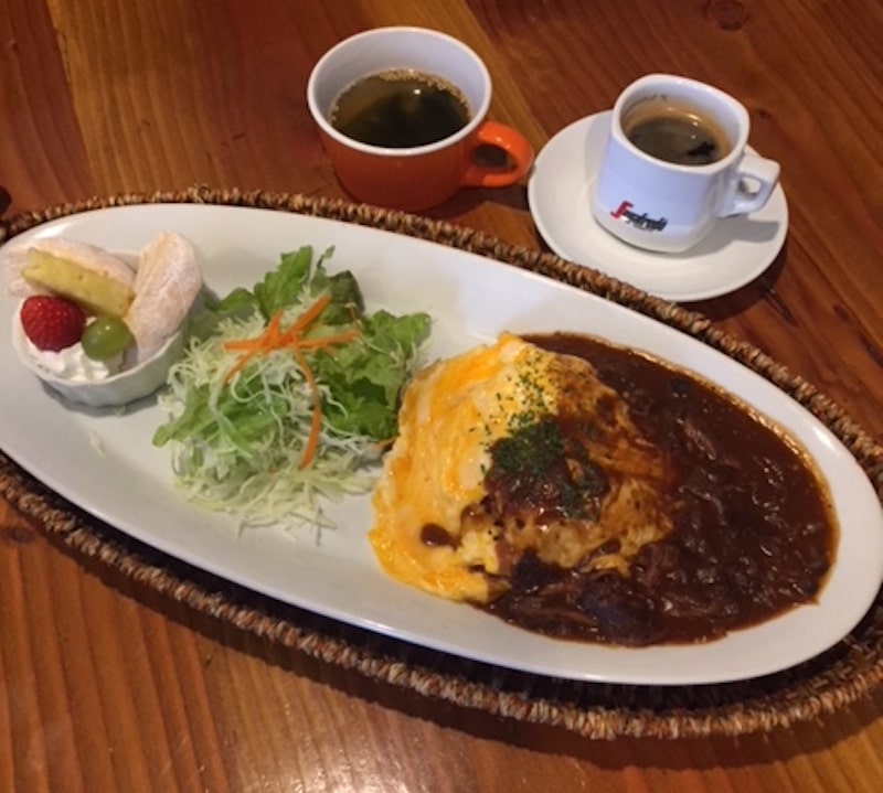 ランチ時間には、とろとろの卵の「オムハヤシ」(1,450円)や、塩麹豚ステーキなどの食事メニューも注文できます。