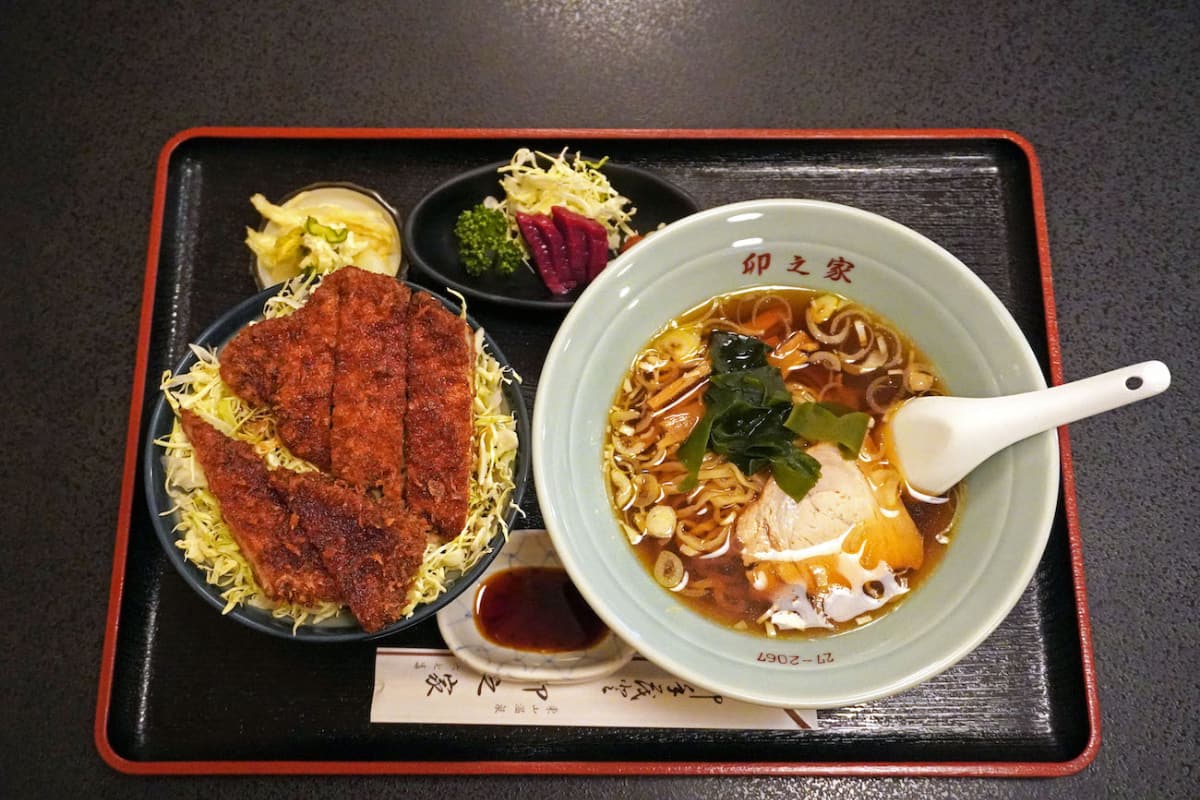 醤油に辛味噌を混ぜて食べる、クセがなく柔らかな馬刺しと、もちっとした麺とスープが相性の良いラーメンがソースかつ丼に付いた「卯之家セット」(1,300円)もおすすめです。