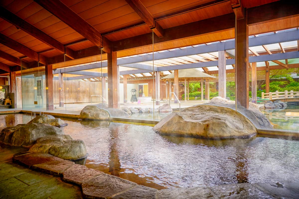 「湯遊天国」の大浴場や露天風呂では、糖尿病、神経痛、筋肉痛などの効能がある、硫黄泉、弱アルカリ泉、マグネシウム泉の3種の泉質の浸かり比べが楽しめます。