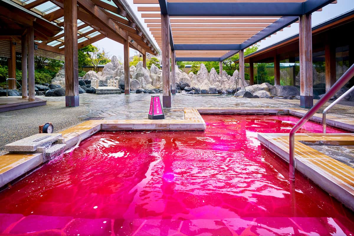 他に、ワイン色のとろりとした肌ざわりが人気の「コラーゲンの湯」などの露天風呂や漢方薬湯などの内湯、足湯など、合計4種類の露天風呂と7種類の内風呂を湯めぐりできます。