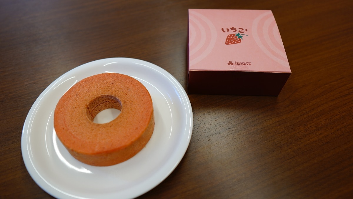 バウムクーヘン工房 はちやの「バウムクーヘン いちご」(1,600円)は、栃木の代表品種のいちご「とちおとめ」をふんだんに使ったバウムクーヘンです。