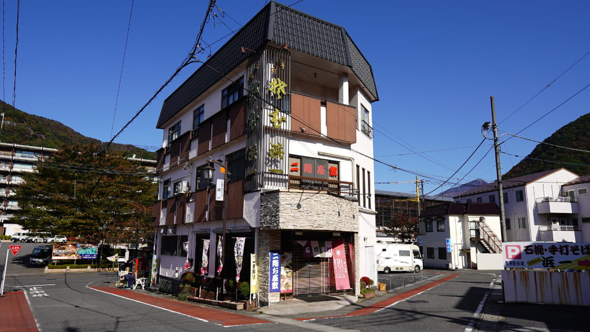 「石臼手打ちそば 浜一(はまいち)」は、ホテル三日月のすぐ近くにある3階建ての建物です。