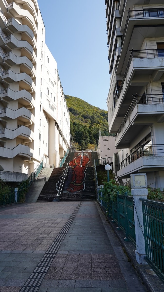 階段は離れると鬼怒太(鬼)が書かれたアートになっており、たびたび鬼怒太を撮影する方もいるちょっとした観光名所でもあります。
